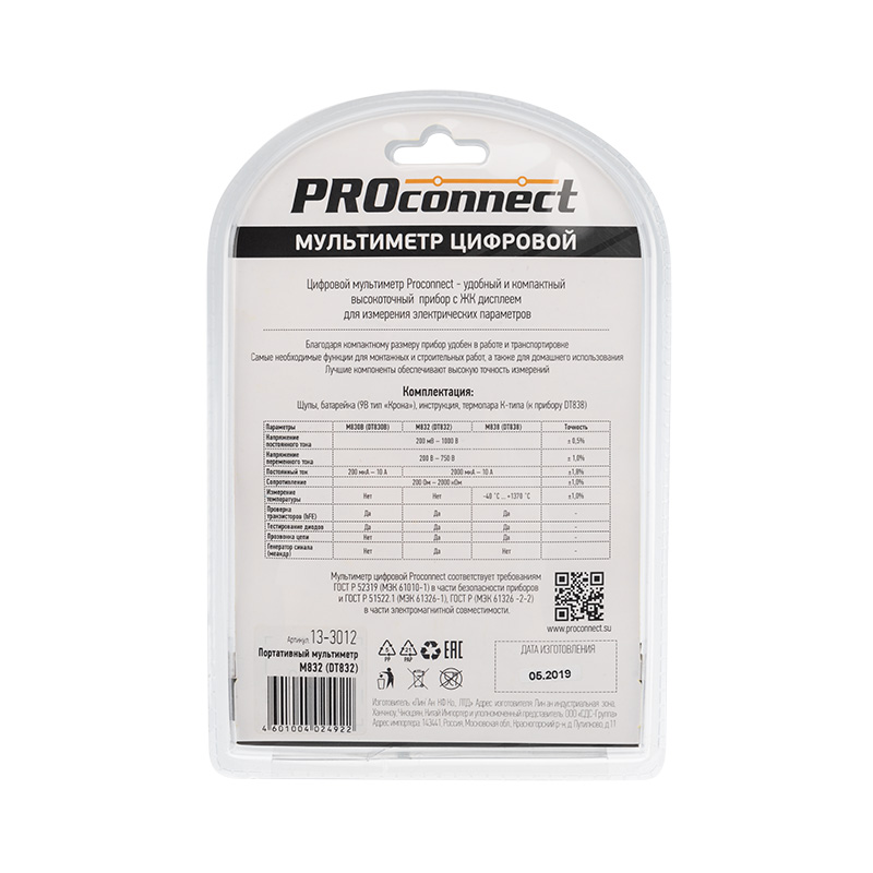 Мульти́метр — электроизмерительный прибор, который включает в себя несколько функций и набор измеряемых параметров. Все приборы серии M832 измеряют постоянное и переменное напряжение, постоянный ток и сопротивление в цепи. А также с помощью данного прибора можно проводить тестирование диодов, и осуществлять прозвонку целостности цепи. Еще одной отличительной особенностью данного прибора является функция генерирования прямоугольных сигналов (меандр), эта функция нужна для измерений и преобразований сигнала и в других областях. Прибор M832 является портативным мультиметром, компактные размеры позволяют всегда носить его с собой. Но, несмотря на малые размеры, данный мультиметр обладает широким функционалом и это выгодно отличает его от других. Инженеры старались сделать прибор максимально удобным для использования. Выбор измеряемых величин и пределов измерений производится с помощью усиленного поворотного регулятора, благодаря которому исключается возможность случайного нажатия. Прибор изготовлен из высококачественных материалов, калибровка и тестирование приборов произведены под контролем компании СДС. Характеристики: Постоянное напряжение: 200 mВ (±0.5%+3), 2000 мВ/20 В/200 В (±0,8%+5), 1000 В (±1,0%+5) Переменное напряжение: 200 В/750 В (±2,0%+10) Постоянный ток: 200 мкА/2000 мкА/20 мА (±1.8%+2), 200 мА (±2,0%+2), 10 A (±2.0%+10) Сопротивление: 200 Ом (±1,0%+10), 200 Ом/20 КОм/200 КОм/2000 КОм (±1,0%+4) Тестирование диодов Прозвонка целостности цепи Генератор прямоугольного сигнала (меандр) 3,5-разрядный дисплей Размер: 70х126х26 мм Тип батареи: PROconnect 9 В «Крона» (в комплекте) Вес: 108 г Комплектация: мультиметр, измерительные щупы, батарея, инструкция, упаковка.