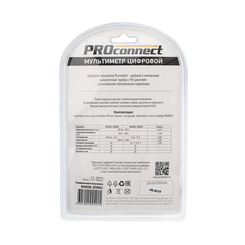 Мульти́метр — электроизмерительный прибор, который включает в себя несколько функций и набор измеряемых параметров. Все приборы серии MAS830 измеряют постоянное и переменное напряжение, постоянный ток, сопротивление в цепи и температуру (для модели 838L). А также с помощью данного прибора можно проводить тестирование диодов и прозвонку целостности цепи. Данные приборы являются более совершенными в линейке мультиметров PROconnect, имеют противоударный бампер, функцию удержания данных на дисплее DATA HOLD — позволяет запомнить данные, если измерение проводится в труднодоступном месте, функцию подсветки дисплея — поможет в темноте или отсутствии электричества и освещения. Прибор MAS830L является портативным мультиметром, компактные размеры позволяют всегда носить его с собой. Но, несмотря на малые размеры, данный мультиметр обладает широким функционалом и это выгодно отличает его от других. Инженеры старались сделать прибор максимально удобным для использования. Выбор измеряемых величин и пределов измерений производится с помощью усиленного поворотного регулятора, благодаря которому исключается возможность случайного нажатия. Прибор изготовлен из высококачественных материалов, калибровка и тестирование приборов произведены под контролем компании СДС. Характеристики: Постоянное напряжение: 200 mВ/2 В (±0,5%+3), 20 В/200 В (±0,8%+5), 600 В (±1%+5) Переменное напряжение: 200 В/600 В (±2%+10) Постоянный ток: 2 мА/20 мА (±1,8%+2), 200 мА(±2,0%+2), 10 A (±2,0%+10) Сопротивление: 200 Ом (±1,0%+10), 2 КОм/20 КОм/200 КОм/2 МОм (±1,0%+4) Тестирование диодов/транзисторов (hfe) Прозвонка целостности цепи Измерение температуры Режим DATA HOLD Подсветка дисплея 3,5-разрядный дисплей Размер: 135х67х33 мм Тип батареи: PROconnect 9 В «Крона» (в комплекте) Противоударный чехол в комплекте Вес: 145 г (включая батарею) Комплектация: мультиметр, измерительные щупы, батарея, термопара тип К, инструкция, упаковка.