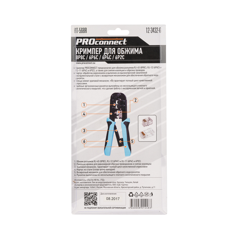 Кримпер PROconnect HT-568R — универсальный инструмент для обжима разъемов RJ-45 (8P8C), RJ-12 (6P6C), RJ-11 (6P4C и 6P2C), а также для снятия изоляции и обрезки проводов. Особенности: - Корпус выполнен из высокопрочной закаленной инструментальной стали с воронением. - Возвратный механизм для обеспечения обратного хода рукояток. - Храповый механизм предотвращает обратный ход рукояток во время цикла обрезки. - Для более удобной работы предусмотрена функция быстрой разблокировки лезвий после обрезки. - Высокопрочные режущие сегменты закругленной формы оптимально обхватывают поверхность кабеля и обрезают его без деформаций и скосов. - Удобные рукоятки, выполненные из нескользящего плотного синтетического покрытия, сделают работу с инструментом легкой и приятной.