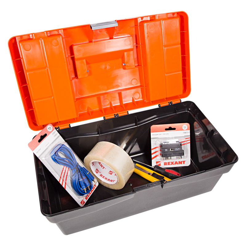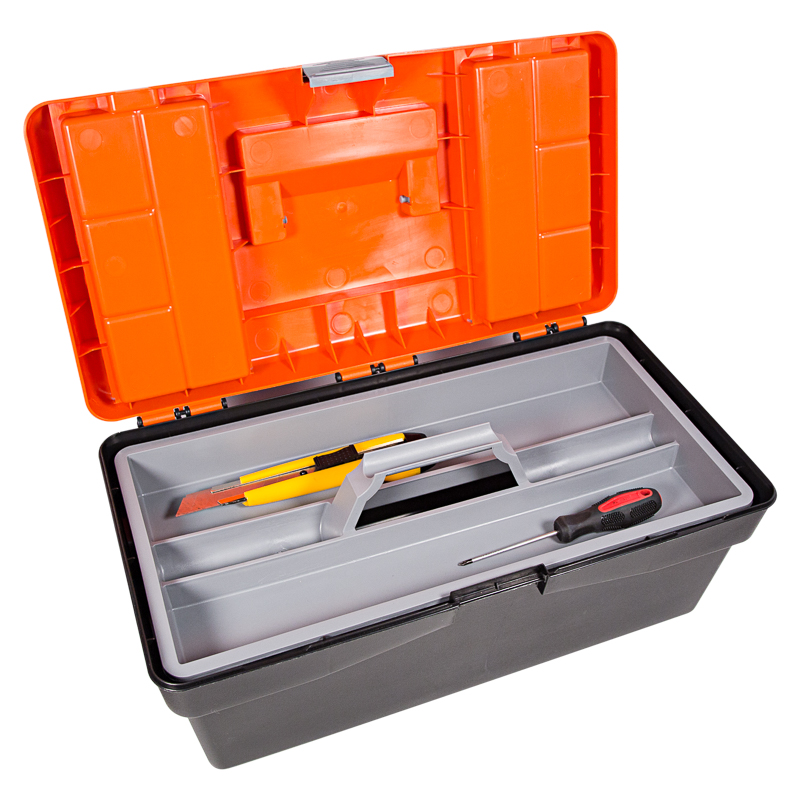Ящик для инструментов PROconnect выполнен из прочного пластика. Обладает съемным 3-секционным лотком с удобной ручкой и 2 встроенными органайзерами с прозрачными крышками. Ящик предназначен для хранения и транспортировки инструментов, крепежных изделий, расходных материалов, в том числе различных предметов, схожих по габаритам. На крышке есть складная ручка. Удобный замок можно открыть одной рукой. Характеристики: Размеры: 420х220х180 мм Количество отсеков в органайзерах: 6 шт. Материал: полипропилен Цвет: черный, оранжевый Преимущества: Полупрозрачная крышка позволяет сразу увидеть, в каком отсеке находятся необходимые предметы Подходит для бытового и профессионального использования Выполнен из прочных долговечных материалов