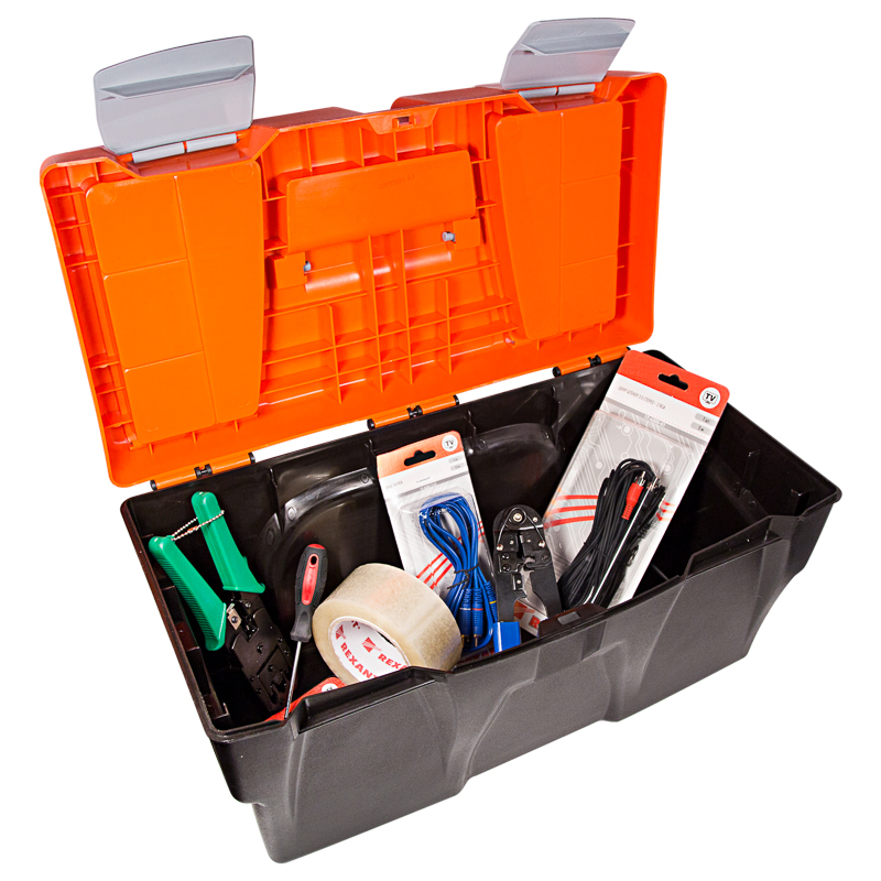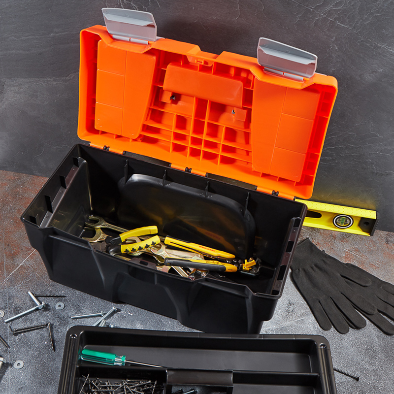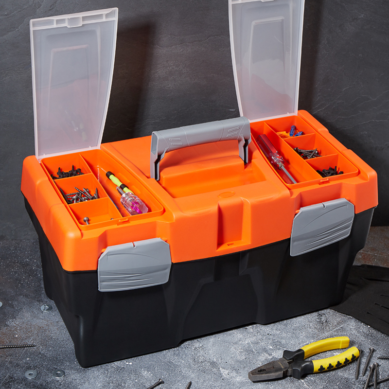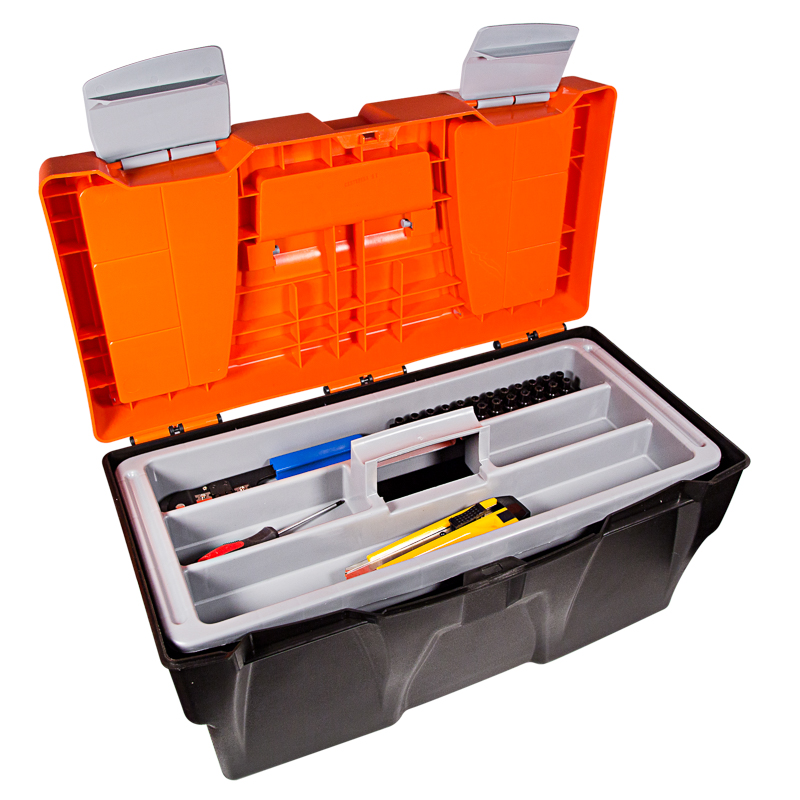 Ящик для инструментов PROconnect выполнен из прочного пластика. Обладает съемным 3-секционным лотком с удобной ручкой и 2 встроенными органайзерами с прозрачными крышками. Ящик предназначен для хранения и транспортировки инструментов, крепежных изделий, расходных материалов, в том числе различных предметов, схожих по габаритам. На крышке есть складная ручка. 2 удобных замка можно открыть одной рукой. Характеристики: Размеры: 500х250х260 мм Количество отсеков в органайзерах: 4 шт. Материал: полипропилен Цвет: черный, оранжевый Преимущества: Полупрозрачная крышка позволяет сразу увидеть, в каком отсеке находятся необходимые предметы Подходит для бытового и профессионального использования Выполнен из прочных долговечных материалов