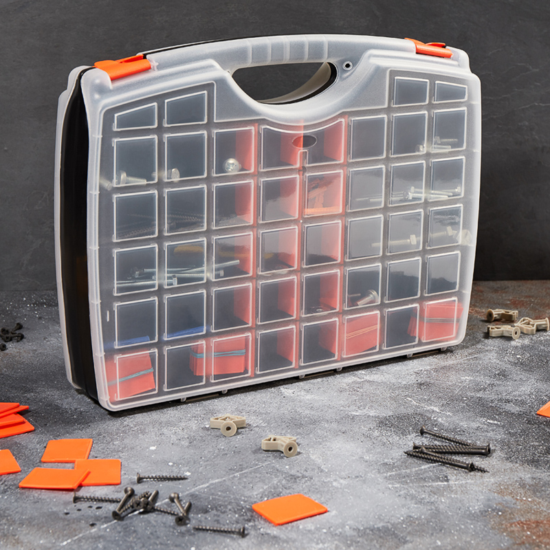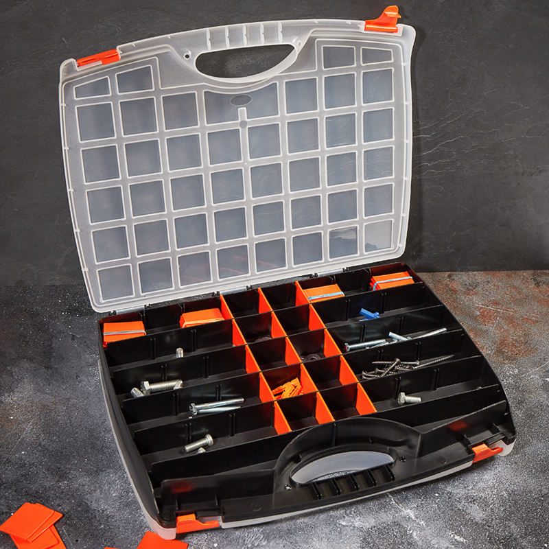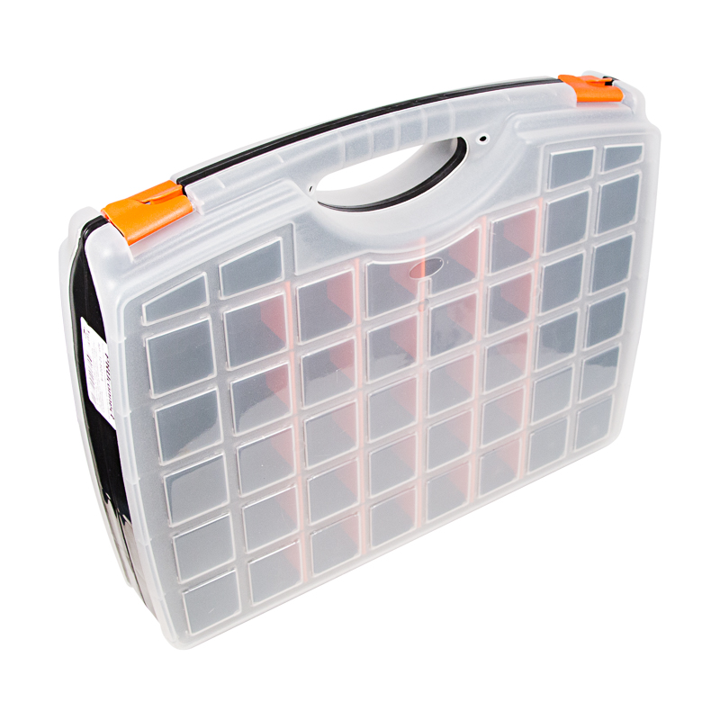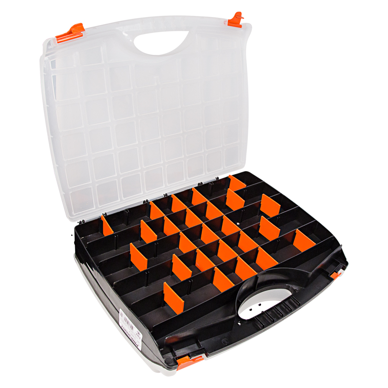 Двухсторонний универсальный ящик PROconnect выполнен из прочного пластика. Предназначен для хранения ручного инструмента, разъемов, расходных материалов, крепежа и рыболовных снастей. Регулируемые секции по размеру и количеству позволяют наилучшим образом организовать пространство для быстрого доступа и хранения инструментов. Характеристики: Размеры: 425х330х85 мм Количество съемных секций: 35 шт. Материал: полипропилен Цвет: белый, черный, оранжевый Преимущества: Большое количество съемных секций позволяет конструировать отсеки нужных размеров Подходит для бытового и профессионального использования Выполнен из прочных долговечных материалов