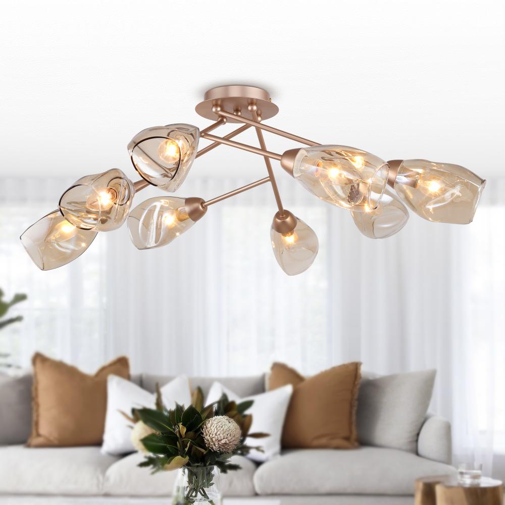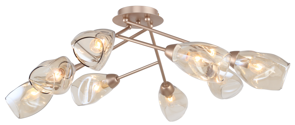 Rivoli Carrie (арт. 3124-308) – люстра потолочная в цвете белое золото, стиль модерн. Количество плафонов – 8. Освещаемая площадь люстры – до 24 м2. Плафоны большой люстры Carrie на потолок изготовлены из стекла, имеют эффектную фигурную форму и слегка затонированы в мягкий тёплый оттенок. Рожки дизайнерской люстры Rivoli Carrie оформлены по мотивам веток дерева или растения с бутонами. Цветочный растительный дизайн – хорошее решение для жилой комнаты. При этом люстры Carrie довольно минималистичны, не утяжеляют интерьер лишним декором. Коллекцию Carrie итальянского бренда Rivoli дополняют потолочные люстры под 6 ламп (арт. 3124-306) и настенные светильники под 2 лампы (арт. 3124-402).